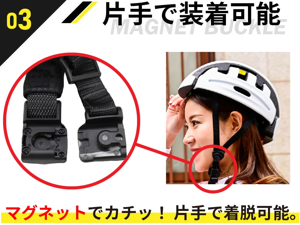 顎のバックルはマグネット式になっているので片手で開け締めも簡単にできます。